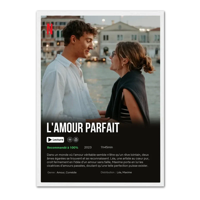 C'est bien plus qu'une simple affiche ! Imaginez votre histoire d'amour, vos rires, vos souvenirs les plus précieux, capturés pour toujours dans un design unique inspiré de vos soirées séries. Vous personnalisez chaque détail pour que cette œuvre devienne le reflet parfait de votre couple, un trésor qui embellira votre intérieur et rappellera chaque jour la magie de votre lien. C'est le cadeau qui parle d'amour, de votre amour, d'une façon que personne d'autre n'aura.