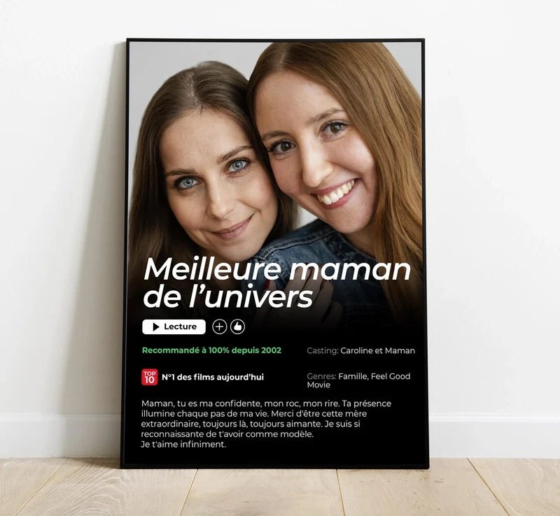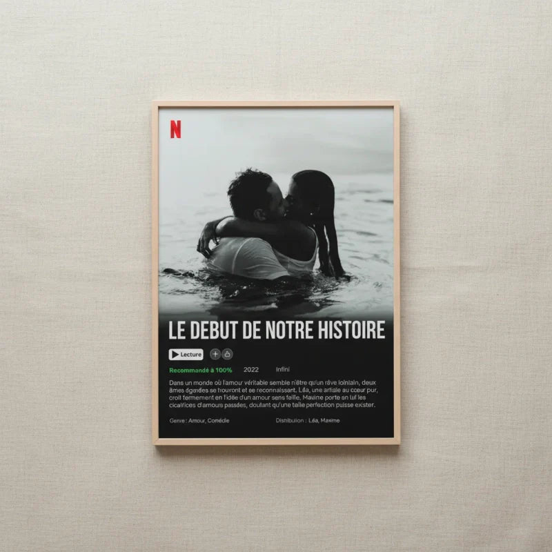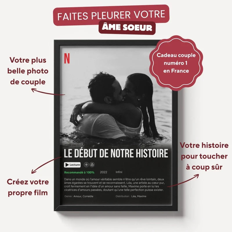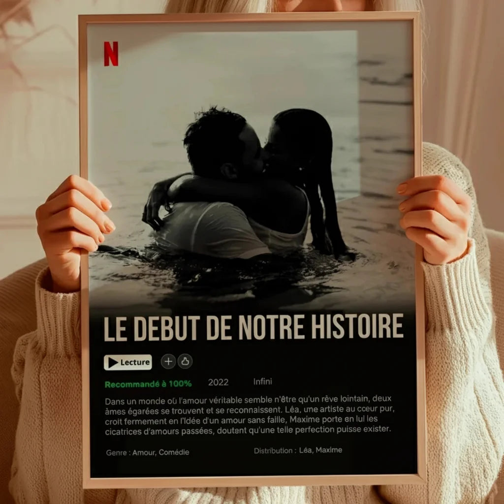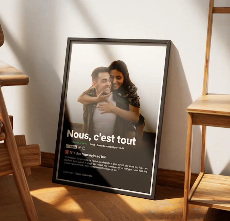 Votre amour est unique, votre cadeau devrait l'être aussi. Transformez vos souvenirs avec vos personnes précieuses en une affiche Netflix personnalisée.